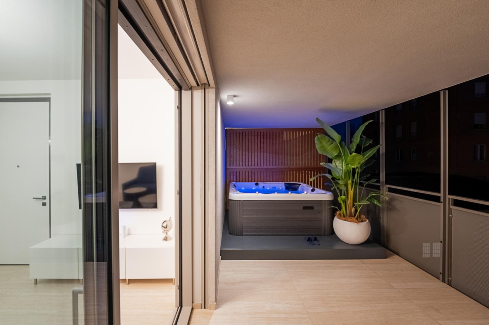 Entspannen Sie in der romantischen Hydromassagewanne mit Farbtherapie, die Ihnen exklusiv auf der privaten Terrasse des Apartments zur Verfügung steht.