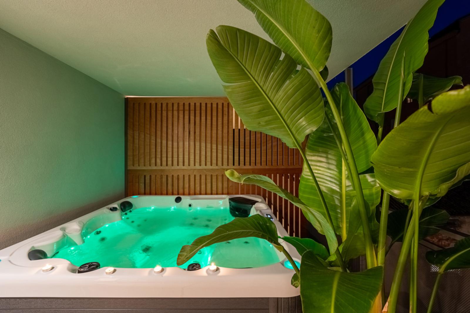 Entspannen Sie in der romantischen Hydromassagewanne mit Farbtherapie, die Ihnen exklusiv auf der privaten Terrasse des Apartments zur Verfügung steht.